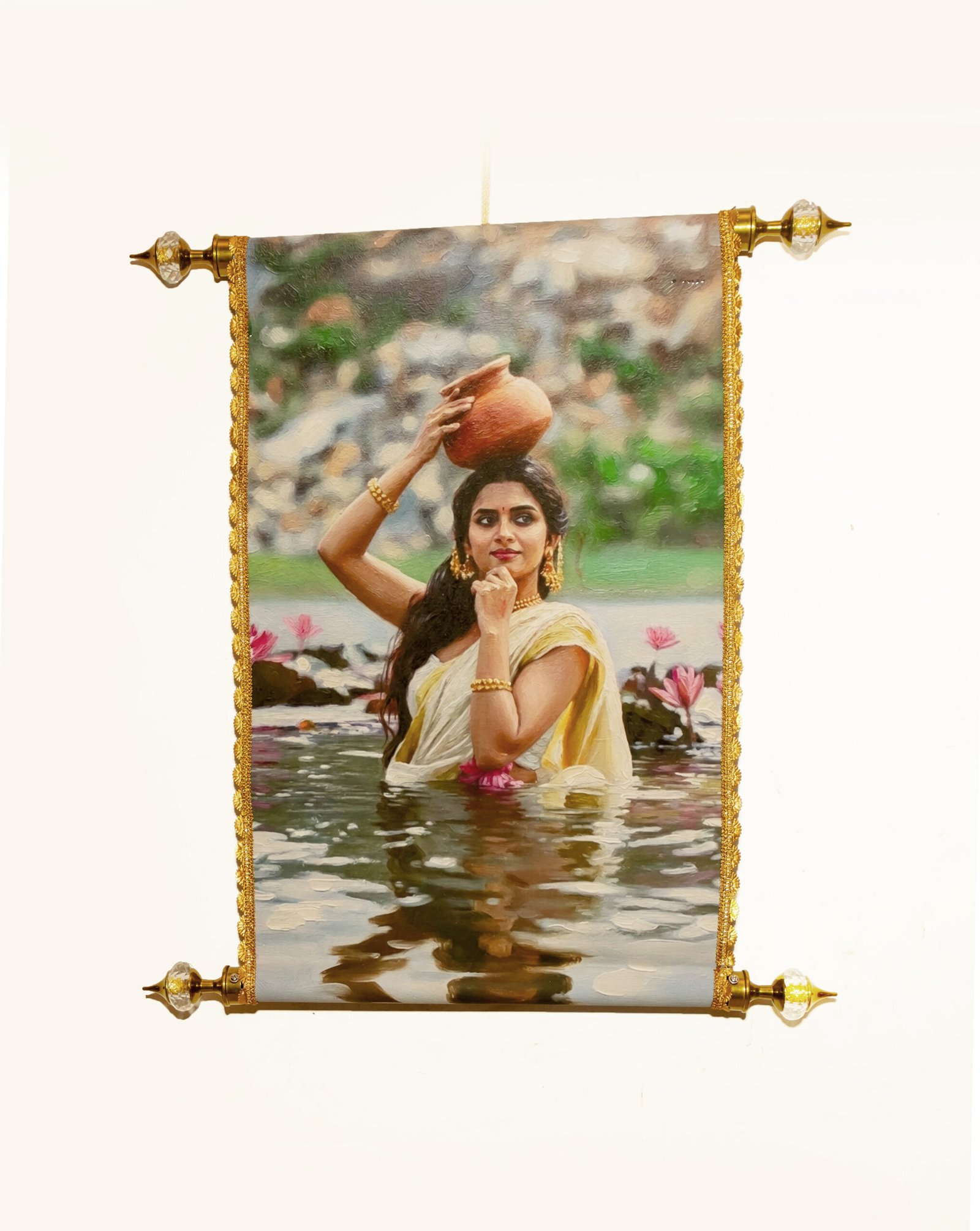 Featuring a graceful subject in a traditional setting, the artwork is finished with a durable, high-quality wall hanging frame that is ready to display. Each stroke is designed to highlight the play of light on water and the intricate details of traditional attire, making it a conversation starter in any space.